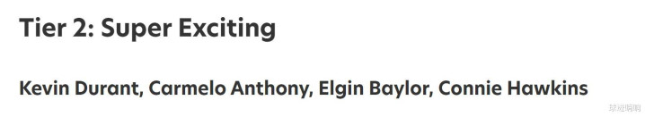 第二档(4人):杜兰特、安东尼、埃尔金贝勒与霍金斯
