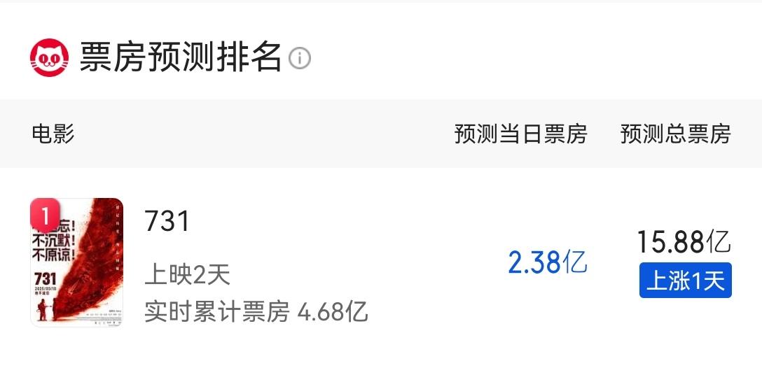 截至记者16:00发稿时,《731》在公映次日拿到1.22亿元票房,当日预测票房在2亿元关口上下,猫眼专业版实时预测《731》总票房为15.88亿元,最终票房走势有赖口碑加持。截至目前,电影《731》并未在豆瓣开分。