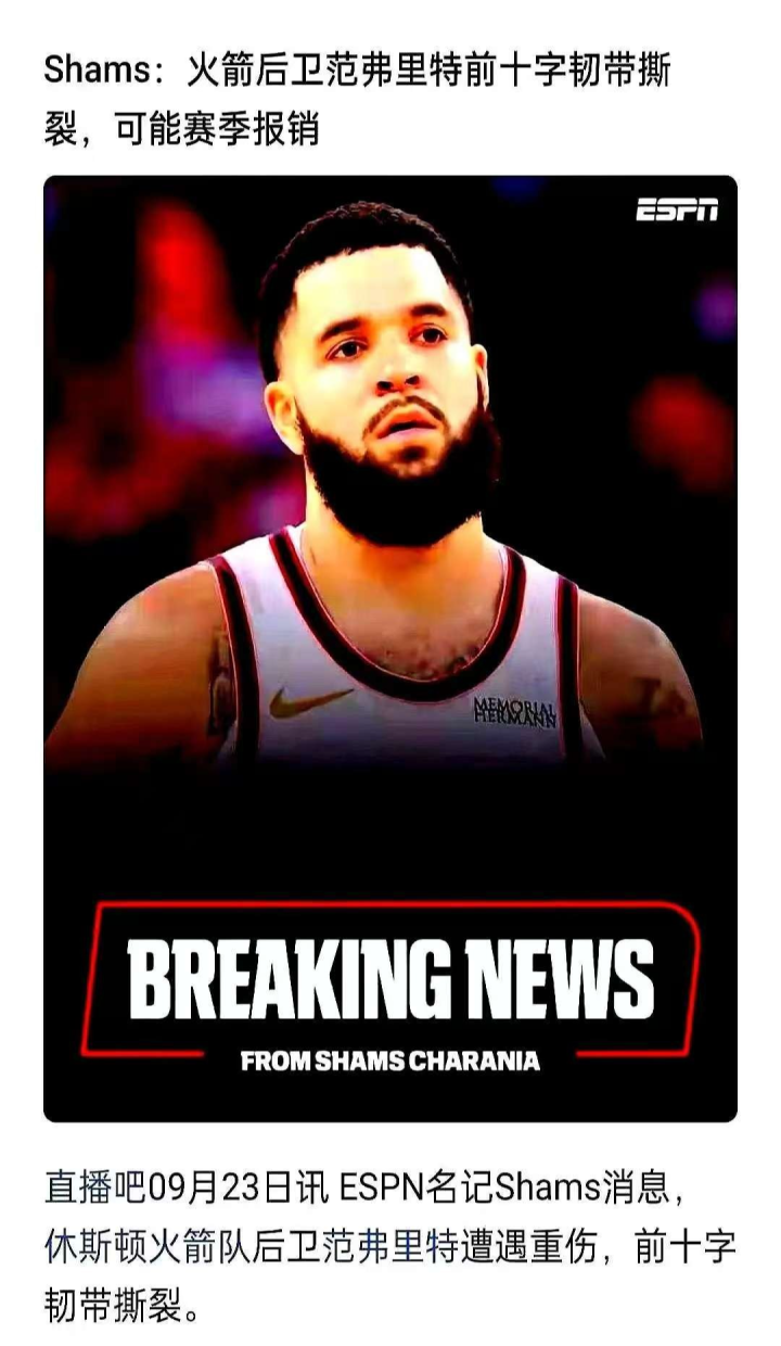同样是后卫位置,主力核心控卫范弗里特在迷你训练营中意外遭遇右膝盖韧带撕裂,整个赛季看来是要报销了。这对于意气风发的火箭队是一个意想不到的沉重打击。在锁死薪金空间甚至连底薪空间都没有的情况下,无奈的火箭队只能内部挖潜启用新人了。而这不是哈登后遗症是什么?本来与哈登谈好回火箭体面养老,结果可怜的哈登又被“放了鸽子”。